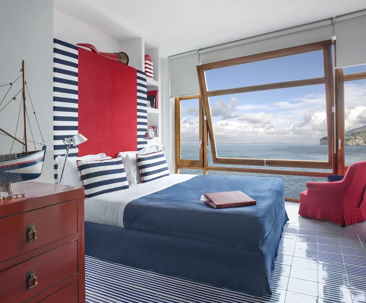 In contrast to Casa Angelina, boutique hotel La Minervetta is alive with colour. This design masterpiece is 40 minutes from Positano in Sorrento. La Minervetta was built in the 1950s originally as a restaurant and has been in the same family since then. In 2006, it was restored and brought back to life by Marco de Luca, the grandson of Giovanni Cacace Sorrentine and Wanda Schwartz, who fell in love with Sorrento and had the vision to build this stunning clifftop hideaway. Marco’s eye for detail and architectural perspective is evident in the witty and colour interiors, making La Minervetta one of the coolest places to stay on the Amalfi Coast, perfect for a sunny summer holiday or la dolce far niente.